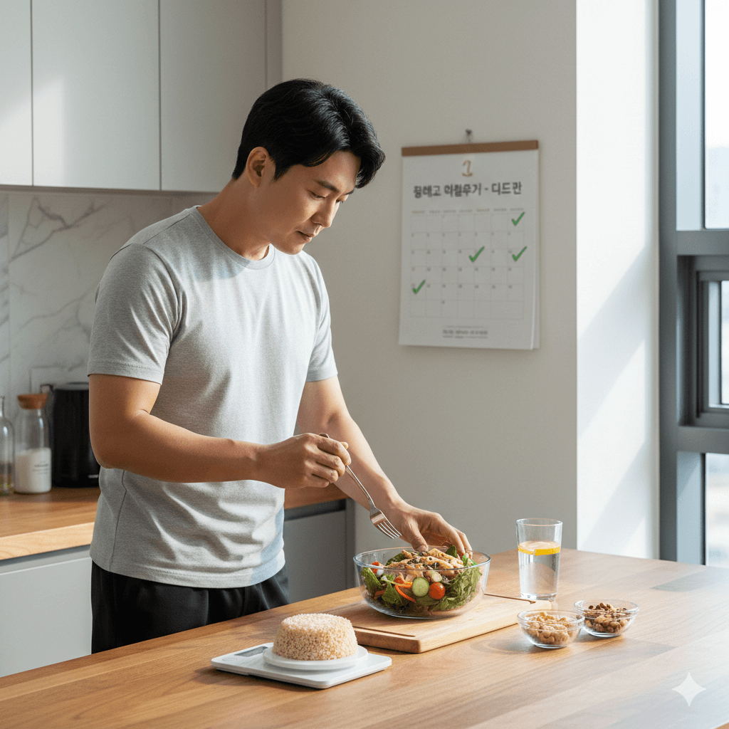 천천히, 꼭꼭 씹어 먹기 — 빨리 먹으면 포만감을 느끼기 전에 과식하게 돼요. 뇌가 배부름을 인식하는 데 약 20분이 걸리거든요. 저도 예전엔 밥을 5분 안에 다 먹었는데… 그게 문제였더라고요 (웃음).