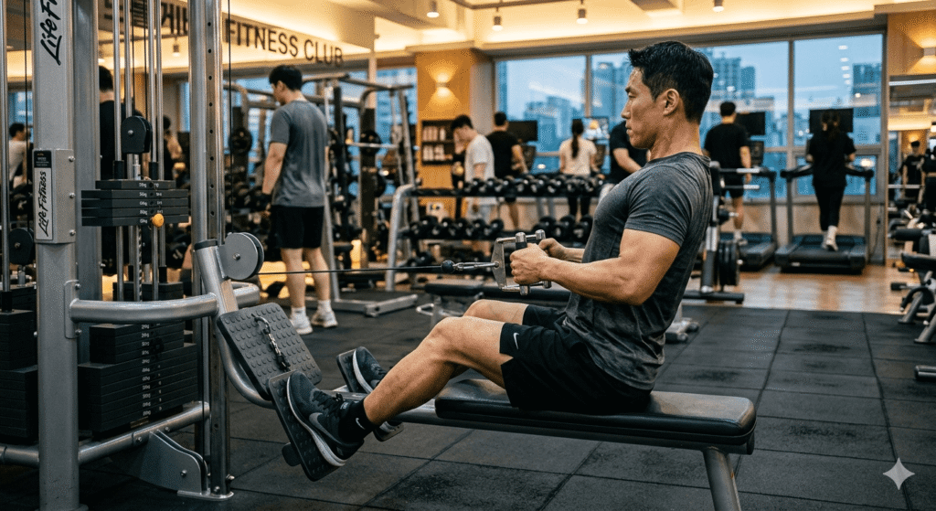 렛풀다운이 등의 넓이를 만든다면, 시티드 로우는 두께를 만들어주는 운동이에요. 케이블을 배꼽 쪽으로 당기면서 날개뼈를 뒤로 모아주는 동작인데, 이게 제대로 되면 등 중앙부에 묵직한 자극이 오거든요. 음~ 이 자극이 오기까지 한 달 넘게 걸렸어요 솔직히. 근육 연결이 안 되면 그냥 팔 운동이 돼버려서요.