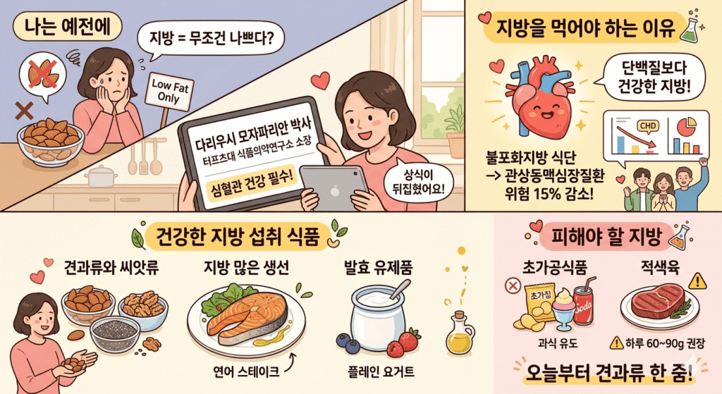 그 뒤로 이것저것 찾아보기 시작했고, 미국 심장내과 전문의이자 터프츠대 식품의약연구소 소장인 다리우시 모자파리안 박사의 이야기를 접하게 됐어요. 심장 전문의가 직접 “건강한 지방 섭취는 필수”라고 말하는 걸 보고, 제 상식이 완전히 뒤집혔달까요. ^^
