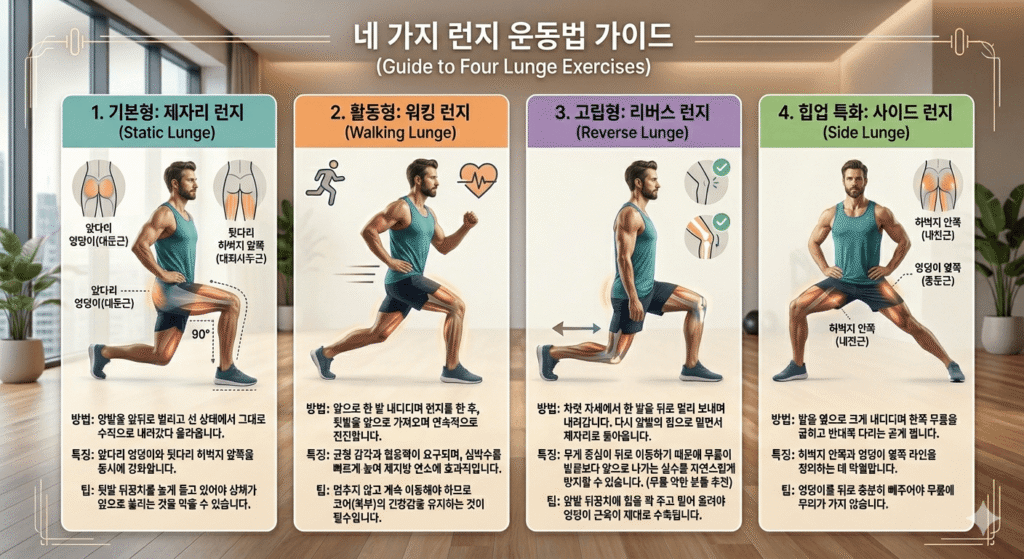 처음엔 “이거 그냥 다리 구부렸다 펴는 거 아냐?” 싶었는데… 아, 완전히 착각이었습니다. 제대로 자세 잡고 내려가는 순간, 허벅지 앞쪽부터 엉덩이 깊은 곳까지 불이 붙는 느낌. 운동 좀 해봤다는 사람도 런지는 처음엔 10개 넘기기가 쉽지 않아요. 저도 처음엔 좌우 각 10개씩 겨우 했는데, 다음 날 근육통이 어마어마했습니다 ^^;